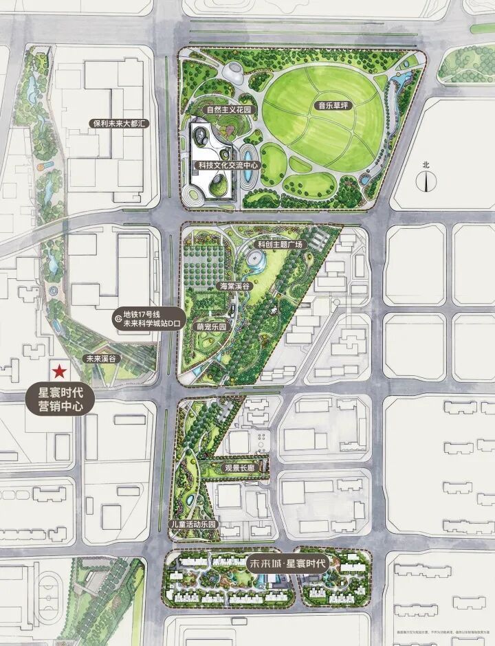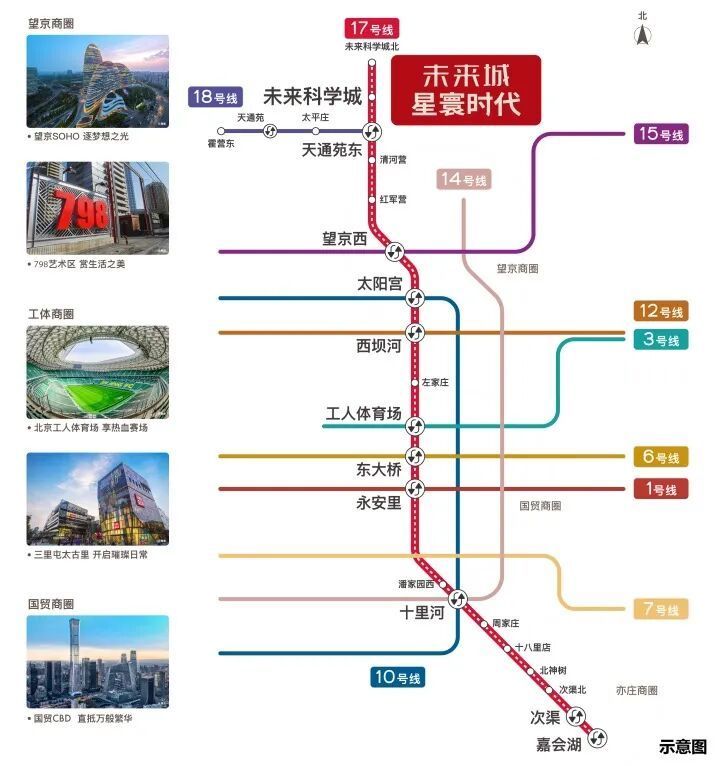 以星寰时代为例,它距离地铁17号线「未来科学城站」约400米,一站换乘18号线,快速直达海淀上地等核心区域,4站望京、5站太阳宫、8站工体、10站永安里。